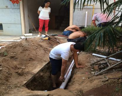 時間已近十二點,維修人員顧不上吃飯休息,歷時一個多小時開挖地面一米左右,查找出了問題管網,該段管網發生斷裂,必須斷水進行更換維修。為了盡快完成維修,不影響業主正常生活,維修人員頂著烈日,在又小又臟又悶熱的地洞里進行搶修,最終在下午五點順利完成了維修工作,恢復了正常用水。